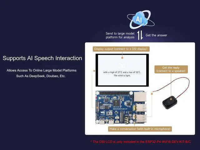 GPIOsSecurity features: Secure Boot, Flash Encryption, cryptographic accelerators, and TRNG. Additionally, hardware access protection mechanisms help to enable Access Permission Management and Privilege SeparationPackage ContentESP32-P4-WIFI6-DEV-KIT x 18 2W speaker x 1NOTE: Online Development Resources and Technical Support are provided, please feel free to contact us if you have any problem!