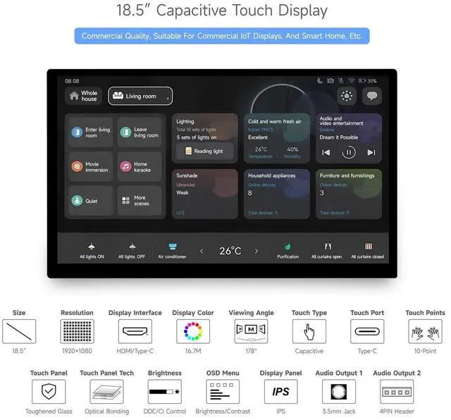 Capacitive Touch: Up to 10-point touch, depending on the operating system. Up to 6H hardness toughened glass panel. Optical bonding, display well and dustproof ^^