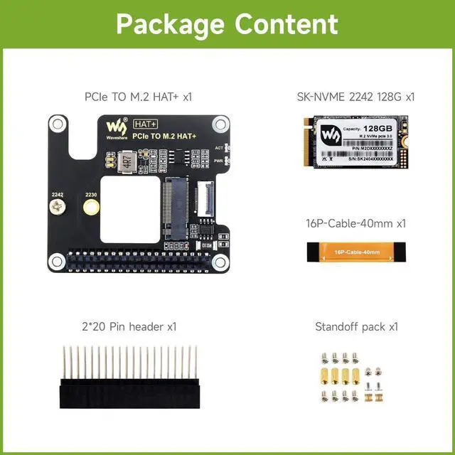 This package comes with a Waveshare SK-NVME 2242 128G Solid State Drive. * Images for reference only, please refer to the Package Content for detailed part list. ^^ Adapter For NVMe Protocol M. 2 Solid State Drive, High-Speed Reading/Writing ^^ Based On 16PIN PCIe Interface Of Raspberry Pi 5. Compatible With 2230/2242 Size M. 2 Solid State Drive ^^ Supports Gen2 And Gen3 Modes, Supports Booting PI5 From Solid State Drive. Easy To Monitor The Working Status ^^ Real-Time Monitoring Of Solid State Drive Power Status For More Stable Operation ^^ Better Cooling Effect For Pi5 And Solid State Drive