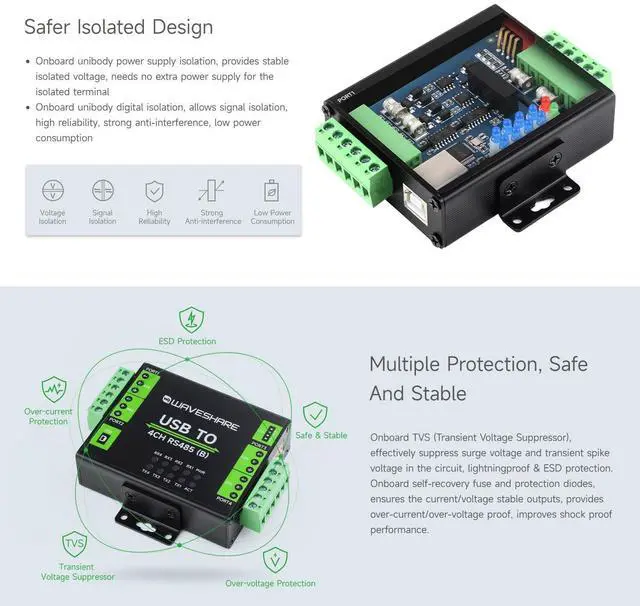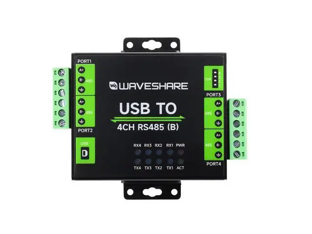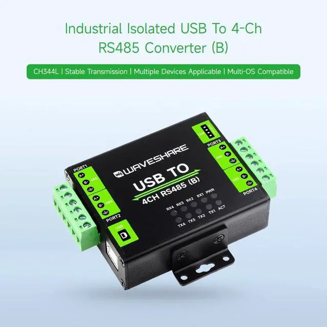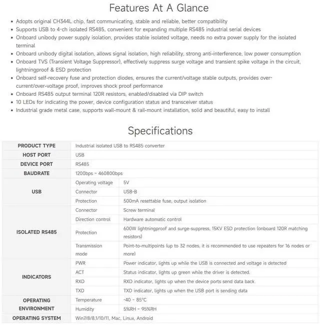 Adopts original CH344L chip, fast communicating, stable and reliable, better compatibility ^^ Supports USB to 4-ch isolated RS485, convenient for expanding multiple RS485 industrial serial devices ^^ Onboard unibody power supply isolation, provides stable isolated voltage, needs no extra power supply for the isolated terminal ^^ Onboard unibody digital isolation, allows signal isolation, high reliability, strong anti-interference, low power consumption ^^ Onboard TVS (Transient Voltage Suppressor), effectively suppress surge voltage and transient spike voltage in the circuit, lightningproof & ESD protection ^^ Onboard self-recovery fuse and protection diodes, ensures the current/voltage stable outputs, provides over-current/over-voltage proof, improves shock proof performance ^^ Onboard RS485 output terminal 120R resistors, enabled/disabled via DIP switch ^^ 10 LEDs for indicating the power, device configuration status and transceiver status ^^ Industrial grade metal case, supports wall-mount & rail-mount installation, solid and beautiful, easy to install