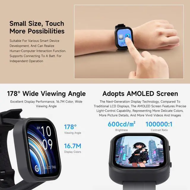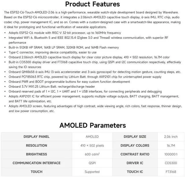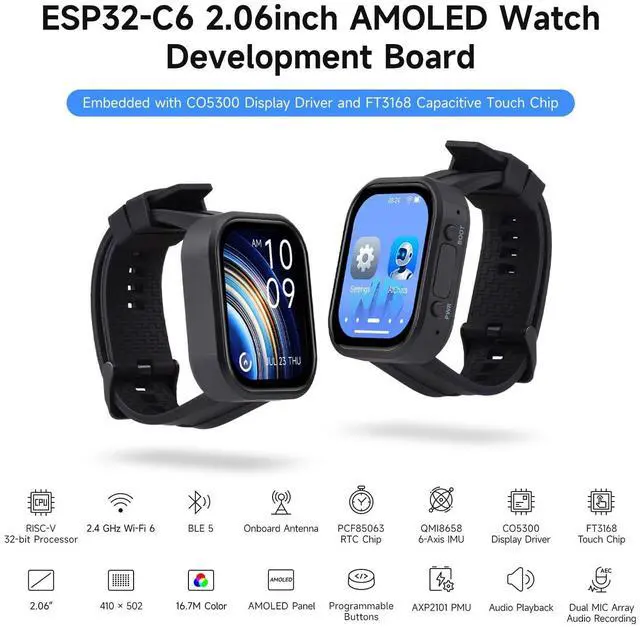 ^^ Tri-Mode Wireless Connectivity: Supports W-F 6, BLE5, IEEE 802.15. 4; onboard antenna for excellent RF performance. ^^ 2.06 -Inch AMOLED Touch