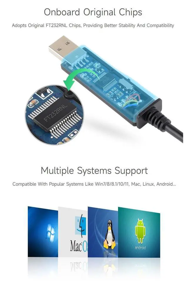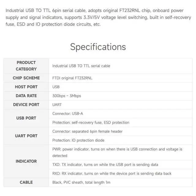 Suitable for serial port debugging of industrial equipments, with hardware flow control ^^ Industrial USB TO TTL 6pin serial cable, adopts original FT232RNL chip, onboard power supply and signal indicators, supports 3.3V /5V voltage level switching, built in self-recovery fuse, ESD and IO protection diode circuits, etc. ^^ Adopts Original FT232RNL Chips, Providing Better Stability And Compatibility ^^ Compatible With Popular Systems Like Win7/8/ 8.1 /10/11, Mac, Linux, Android... ^^ Easily Checking The Operating Status, Convenient For Programming / Debugging