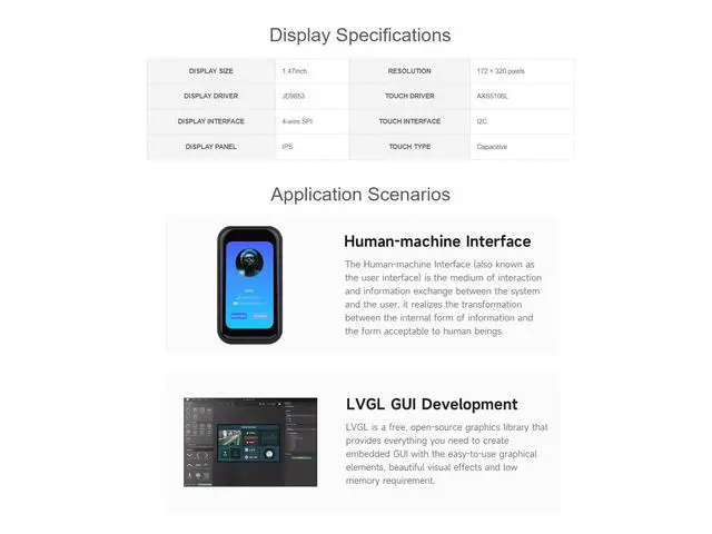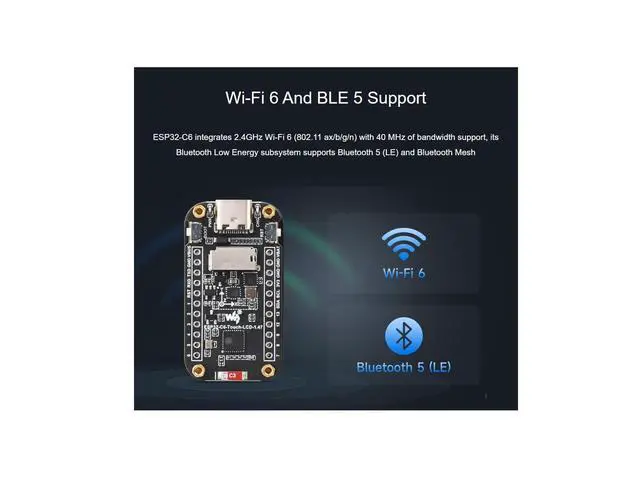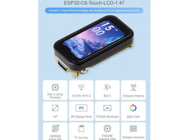 ESP32-C6 1.47 inch Touch Display Development Board, 172320 Resolution, 262K Display Color, Supports Wi-Fi 6 / BLE 5, 160MHz RISC-V ProcessorFeaturesESP32-C6-Touch-LCD- 1.47 uses ESP32-C6FH8 chip with 2.4GH z WiFi 6 and Bluetooth BLE 5 support, integrates 8MB Flash, Onboard 1.47 inch IPS displaycan smoothly run GUI programs such as LVGL. It is suitable for the quick development of the HMI and other ESP32-C6 applications. Equipped with a high-performance 32-bit RISC-V processor with clock speed up to 160 MHz, and a low-power 32-bit RISC-V processor with clock speed up to 20MHzSupports 2.4GH z Wi-Fi 6 ( 802.11 ax/b/g/n) and Bluetooth 5 (LE), with onboard antennaBuilt-in 320KB ROM, 512KB HP SRAM, and 16KB LP SRAM, integrates 8MB FlashOnboard 1.47 inch capacitive touch LCD display, 172320 resolution, 262K colorAdapting multiple IO interfaces, supports full-speed USB standardOnboard TF card slot for external TF card storage of pictures or filesSupports accurate control such as flexible clock and multiple power modes to realize low power consumption in different scenariosUsage InstructionsESP32-C6-Touch-LCD- 1.47 currently provides two development tools and frameworks, Arduino IDE and ESP-IDF, providing flexible development options, youcan choose the right development tool according to your project needs and personal habits.