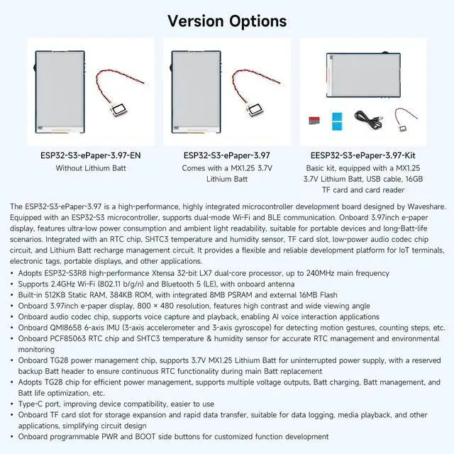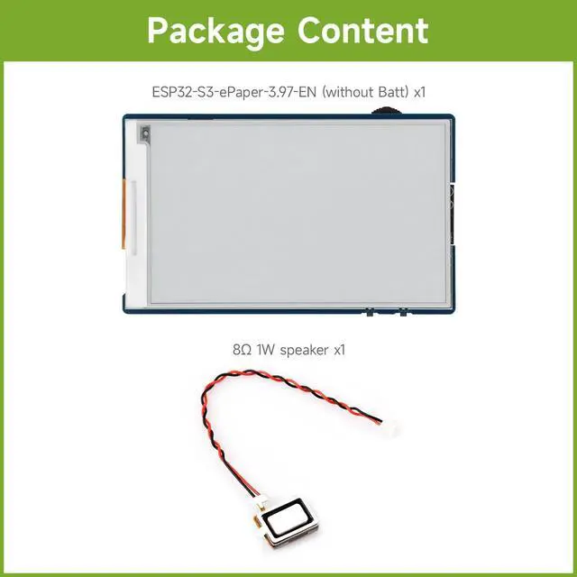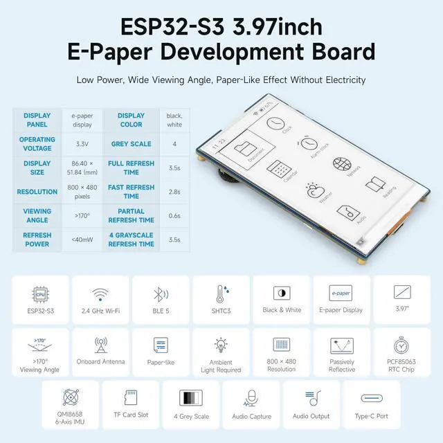 Equipped with ESP32-S3R8 high-performance dual-core processor, max main frequency up to 240MHz ^^ Supports 2.4GH z Wi-Fi & Bluetooth 5 (LE), with onboard antenna ^^ Built-in multi-spec storage, integrated 8MB PSRAM + external 16MB Flash ^^ Comes with 3.97 -inch e-paper display (800480), high contrast & wide viewing angle ^^ Onboard audio codec, 6-axis IMU, temp&humidity/RTC chips for multi-scenario expansion