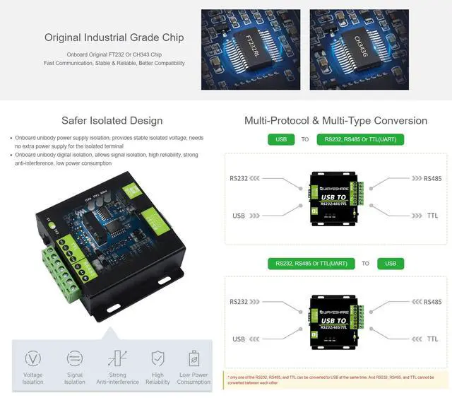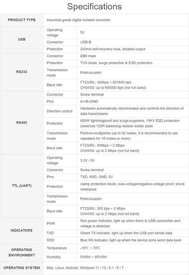 This is an industrial USB to RS232/485/TTL isolated converter with original FT232RL inside. It features embedded protection circuits such as power isolation ADI magnetical isolation and TVS diode etc. What's more the USB TO RS232/485/TTL comes with an aluminium alloy enclosure make it solid and durable to work. ^^ The USB TO RS232/485/TTL is very easy to use fully automatic transceiving without delay. Due to its fast communication stability reliability and safety it is an ideal choice for industrial control equipments and/or applications with high communication requirement. ^^ Fully automatic transceiver circuit with no delay ensures the USB port communicates with different interfaces fastly and stably without interfering each other ^^ Onboard unibody power supply isolation provides stable isolated voltage needs no extra power supply for the isolated terminal ^^ High quality USB-B and RS232 connectors smoothly plug/pull