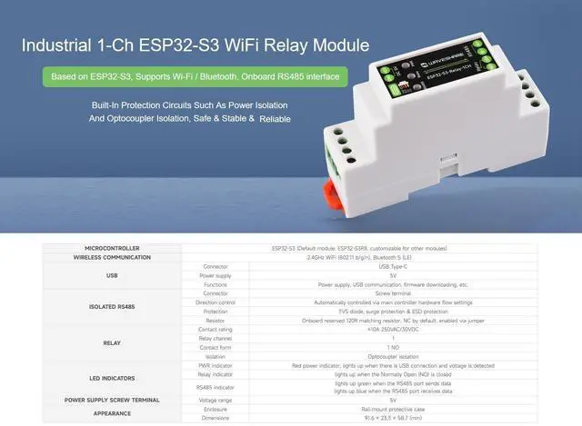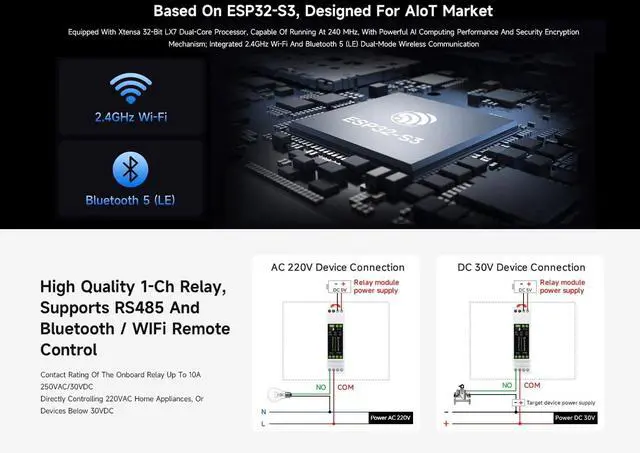 Industrial 1-Channel ESP32-S3 WiFi Relay Module, based on ESP32-S3 microcontroller with 32-bit LX7 dual-core processor, capable of running at 240 MHz, integrated 2.4GH z WiFi ( 802.11 b/g/n) and Bluetooth 5 (LE) dual-mode wireless communication ^^ Onboard high quality 1-Ch relay, supports RS485 and Bluetooth / WIFi remote control, contact rating of the onboard relay up to 10A 250VAC/30VDC, directly controlling 220VAC home appliances, or devices below 30VDC ^^ Onboard isolated RS485 interface for connecting to various RS485 Modbus industrial modules or sensors. Onboard USB Type-C port for power supply, firmware downloading and debugging.