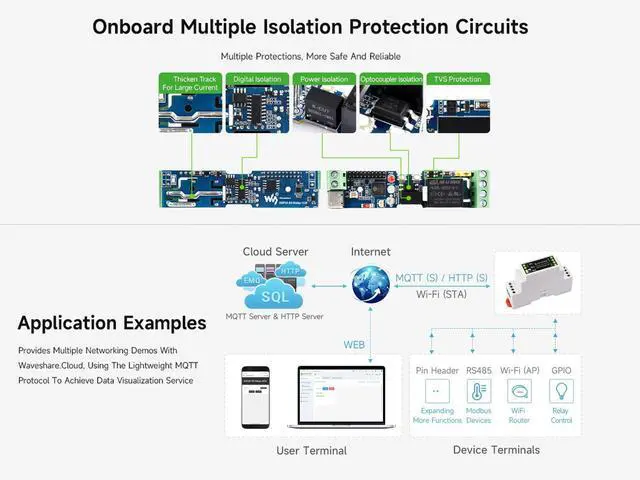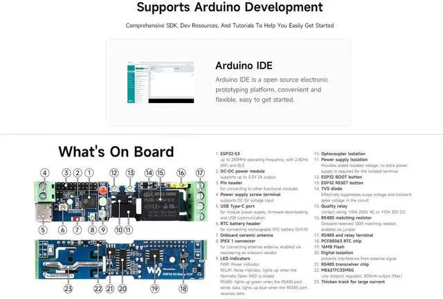 Onboard RTC chip supports scheduled tasks. Onboard power supply screw terminal supports 5V power supply only ^^ Onboard optocoupler isolation, digital isolation, unibody power supply isolation, TVS protection, thicken track for large current multiple isolation protection circuits ^^ Onboard RS485 TX/RX indicators for monitoring the operating status of the module. Rail-mounted protective case, easy to install. Supports Arduino IDE development, online Dev Resources, and tutorials are provided, feel free to contact us if you need