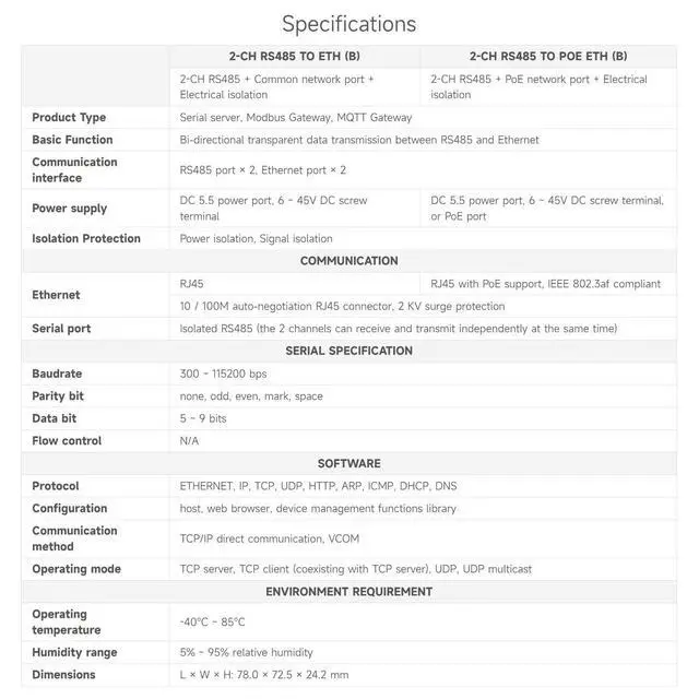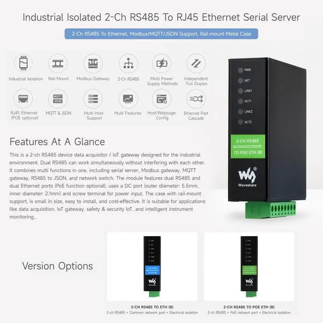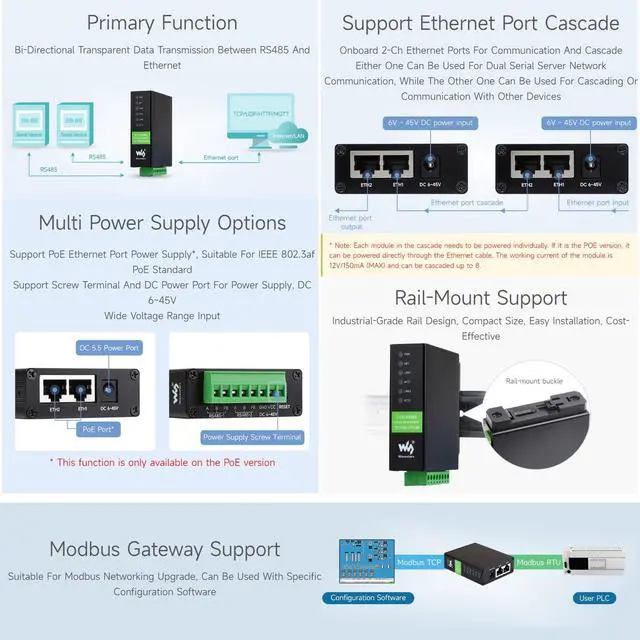 PoE Ethernet Port, This is a 2-ch RS485 device data acquisitor / IoT gateway designed for the industrial environment. ^^ Dual RS485 can work simultaneously without interfering with each other. ^^ It combines multi functions in one, including serial server, Modbus gateway, MQTT gateway, RS485 to JSON, and network switch. ^^ The module features dual RS485 and dual Ethernet ports (PoE function optional), uses a