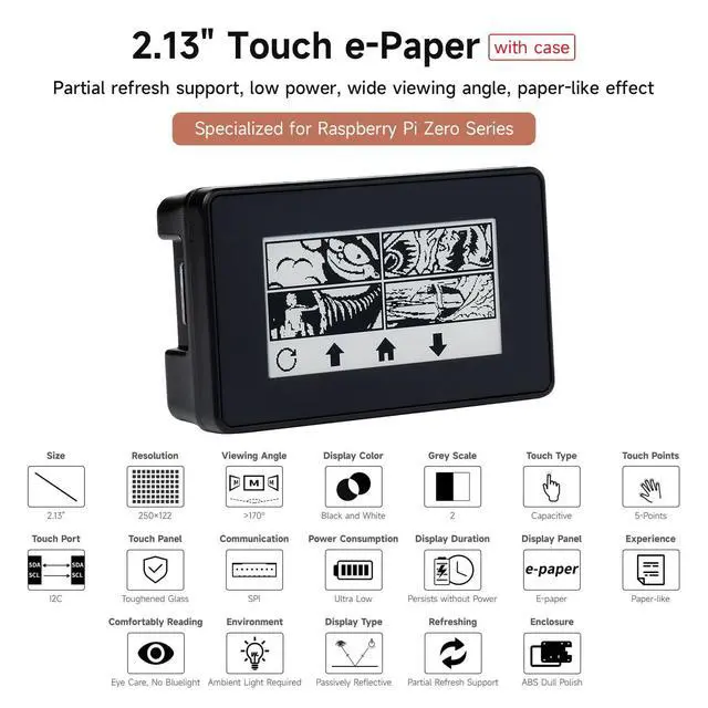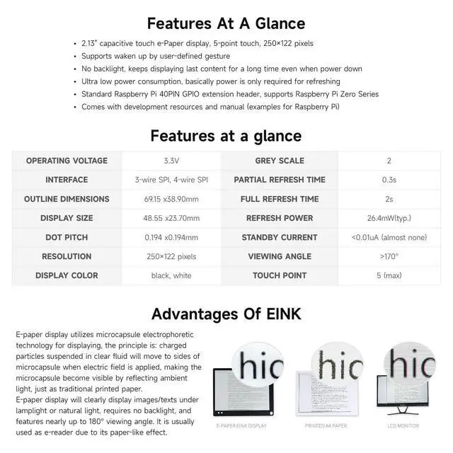 Provide online user manual (examples for Raspberry Pi Raspberry Pi Zero /Zero W) ^^ Partial Refresh Support, Low Power, Wide Viewing Angle, Paper-Like Effect ^^ 2.13" capacitive touch e-Paper display, 5-point touch, 250122 pixels. Supports waken up by user-defined gesture ^^ No backlight, keeps displaying last content for a long time even when power down. Ultra low power consumption, basically power is only required for refreshing ^^ Standard Raspberry Pi 40PIN GPIO extension header, supports Raspberry Pi Zero / Zero W