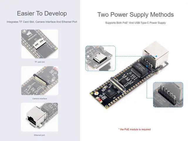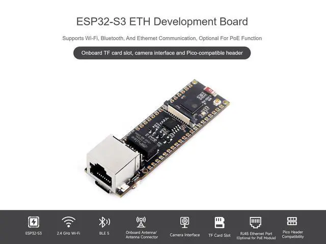 OverviewThis is an ETH development board based on ESP32-S3R8, supports Wi-Fi and Bluetooth wireless communication, with reliable and efficient wired Ethernet connectivity, optional for PoE function. Onboard camera interface, compatible with OV2640, OV5640 and other mainstream cameras for image and video capture. Compatible with Pico header, it can be used with some Raspberry Pi Pico HATs. Relying on the rich ecology and open source resources of ESP32, users can get started quickly for secondary development. It is suitable for Internet of Things, image acquisition, smart home and other AI projects.