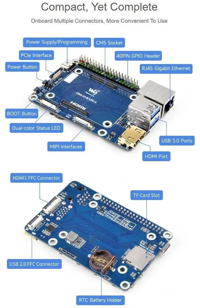 Mini Base Board For Compute Module 5 ^^ Suitable For Evaluating The Raspberry Pi CM5 Or Being Integrated Into End Products ^^ Powerful functions in a credit card sized body ^^ Connecting With Compute Module 5. Standard CM5 Socket And Color-Coded Raspberry Pi 40PIN GPIO Header. Suitable For Compute Module 5 Lite/EMMC Series Module ^^ Compact, Yet Complete. Onboard Multiple Connectors, More Convenient To Use