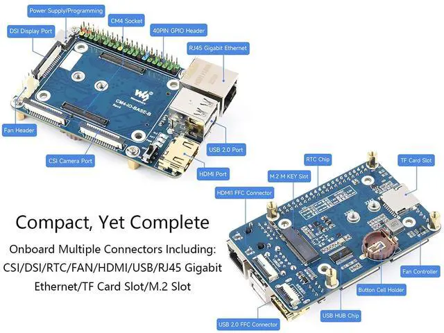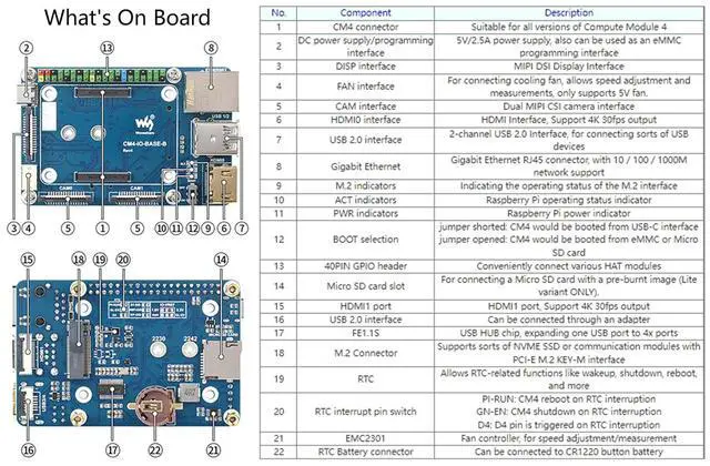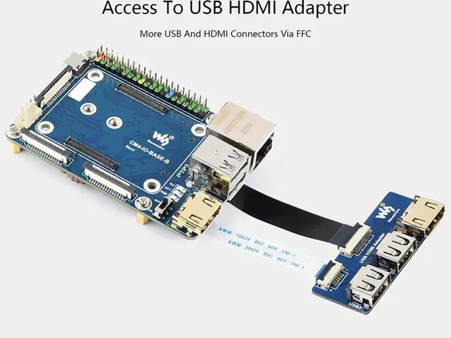 9: USB 2.0 is closed by default, if you need to open it, you need to add dtoverlay=dwc2, dr_mode=host in config. txt. 10. The HDMI1 can be used by a flat cable output, if you need to use it, you can purchase an HDMI adapter. 11. If you need to use USB3/4 and HDMI1 ports at the same time, you can purchase a USB HDMI Adpter. 12. This expansion board does not support the POE function. Package ContentCM4-IO-BASE-B x1Solid State Drives mounting screw x1Online Development Resources /User