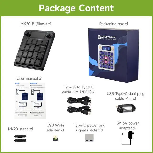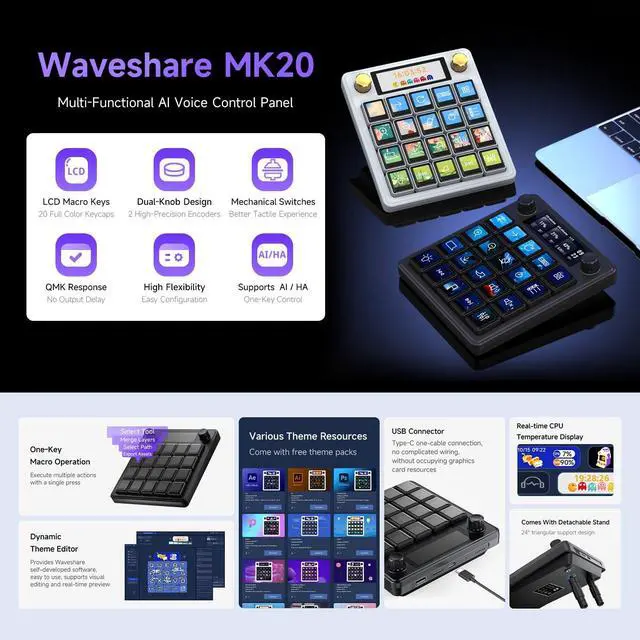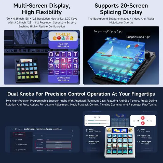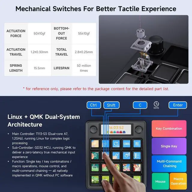 Multi-Functional AI Voice Control Integrate voice commands seamlessly for hands-free operation, boosting productivity and smart interaction. ^^ 200.85" Mechanical LCD Macro Keys Customizable backlit keys with individual LCD screens for dynamic labeling, ideal for gaming, coding, or workflow automation. ^^ 2.8" Secondary Display Supplementary screen shows real-time status, shortcuts, or system info, enhancing multitasking efficiency. ^^ Dual High-Precision Knobs Adjustable dials for volume, brightness, or parameter control with tactile feedbackperfect for precise adjustments. ^^ Linux + QMK Dual-System Support Flexible firmware options (QMK for customization, Linux for compatibility) to tailor functionality to your needs.