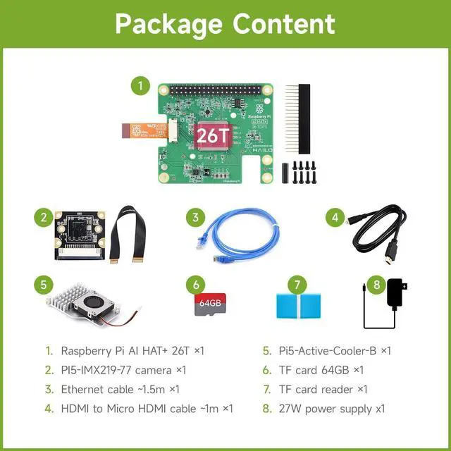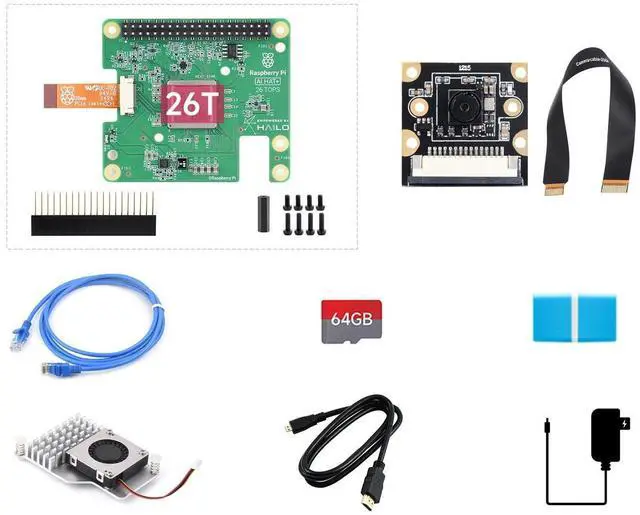 There are several options for this item, this option is PI5 AI Acce D (US), including Raspberry Pi AI HAT+ 26T, PI5-IMX219-77 camera, 64GB TF Card, Cooler, Cable and so on (8 Items). For more details, please click the image2 to check the package content. ^^ Raspberry Pi 5 is the latest generation flagship product in the Raspberry Pi series, following the success of the Raspberry Pi 4. It provides a 2-3x increase in CPU performance over the previous generation. Onboard dual CSI/DSI ports and USB connectors which are provided by the Raspberry Pi RP1 I/O controller.