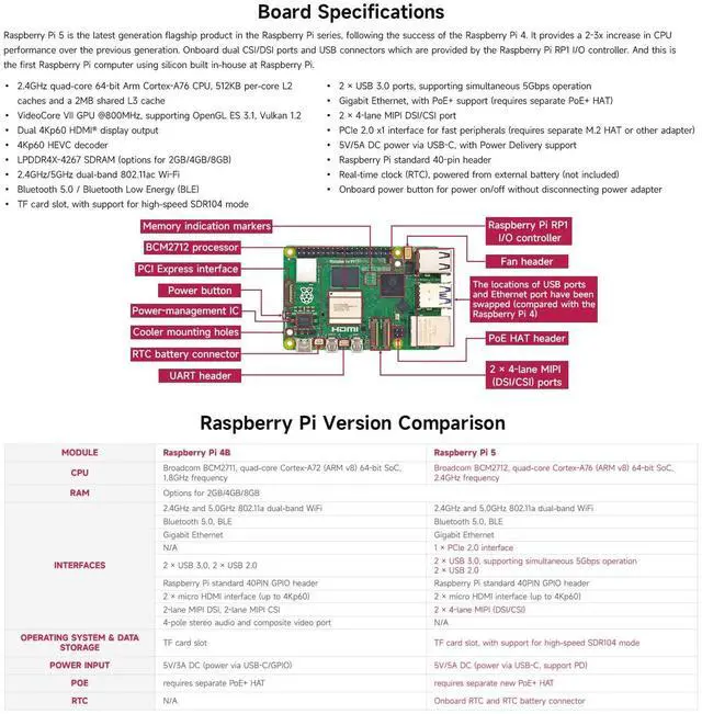 And this is the first Raspberry Pi computer using silicon built in-house at Raspberry Pi. ^^ 2.4GH z quad-core 64-bit Arm Cortex-A76 CPU, 512KB per-core L2 caches and a 2MB shared L3 cache. VideoCore VII GPU @800MHz, supporting OpenGL ES 3.1, Vulkan 1.2. Dual 4Kp60 HDMI display output ^^ 4Kp60 HEVC decoder. LPDDR4X-4267 SDRAM (options for 4GB/8GB). 2.4GH z/5GHz dual-band 802.11 ac Wi-Fi. Bluetooth 5.0 / Bluetooth Low Energy (BLE). TF card slot, with support for high-speed SDR104 mode ^^ 2 USB 3.0 ports, supporting simultaneous 5Gbps operation.