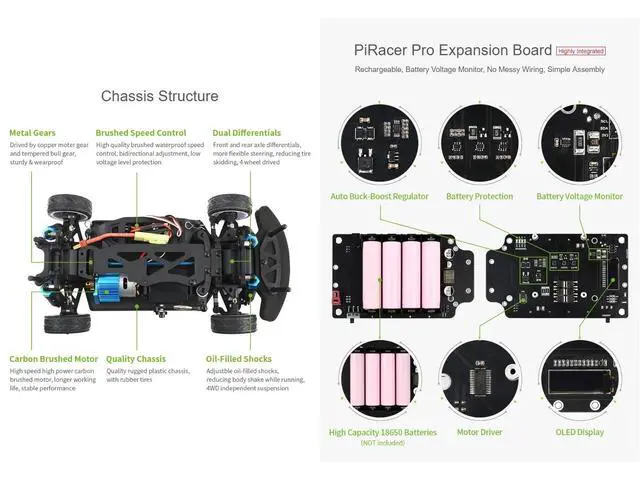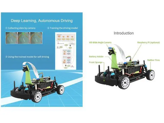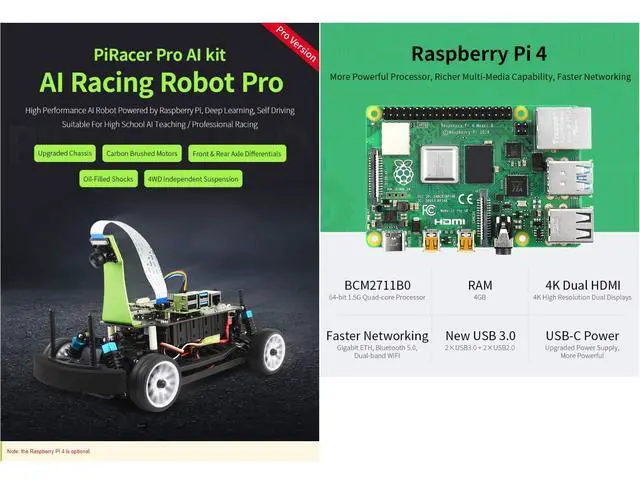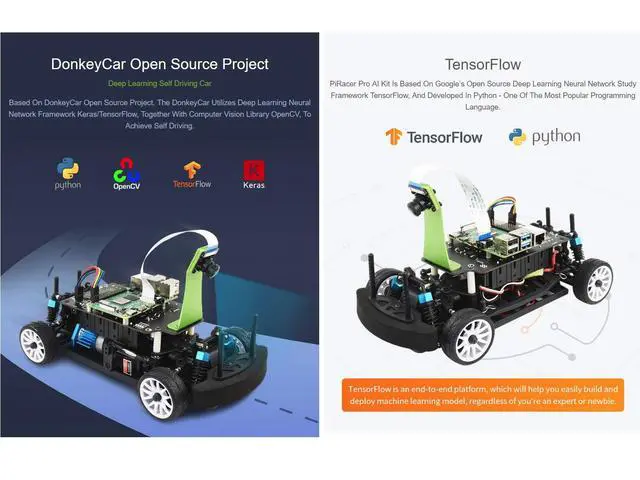 High Speed AI Racing Robot Powered by Raspberry Pi 4, Supports DonkeyCar Project, Pro Version ^^ High performance AI robot, deep learning, self driving, suitable for high school AI learning/professional racing ^^ Upgraded chassis, carbon brushed motors, front& rear axle differentials, oil-filled shocks, 4WD independent suspension, 5MP 160 FOV Camera ^^ Based On DonkeyCar Open Source Project. The DonkeyCar Utilizes Deep Learning Neural Network Framework Keras/TensorFlow, Together With Computer Vision Library OpenCV, To Achieve Self Driving. ^^ PiRacer Pro AI Kit Is Based On Googles Open Source Deep Learning Neural Network Study Framework TensorFlow, And Developed In Python - One Of The Most Popular Programming Language.