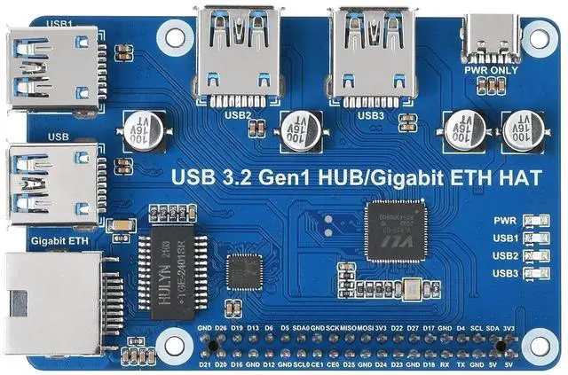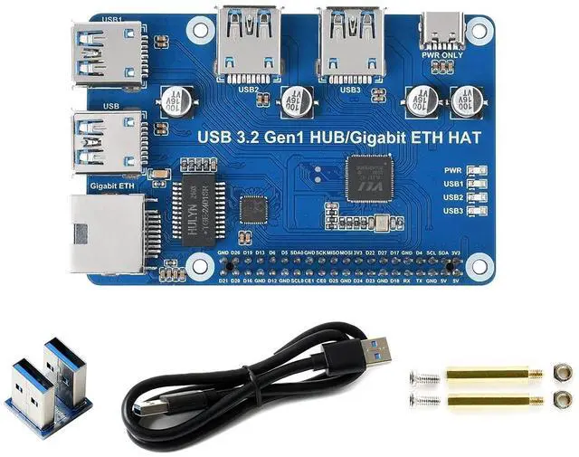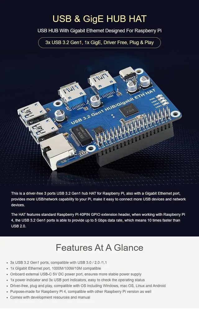 3x USB 3.2 Gen1 ports, compatible with USB 3.0 / 2.0 / 1.1. 1x Gigabit Ethernet port, 1000M/100M/10M compatible ^^ Onboard external USB-C 5V DC power port, ensures more stable power supply ^^ 1x power indicator and 3x USB port indicators, easy to check the operating status ^^ Driver-free, plug and play, compatible with OS including Windows, mac OS, Linux and Android ^^ Purpose-made for Raspberry Pi 4, compatible with other Raspberry Pi version as well. Comes with development resources and manual