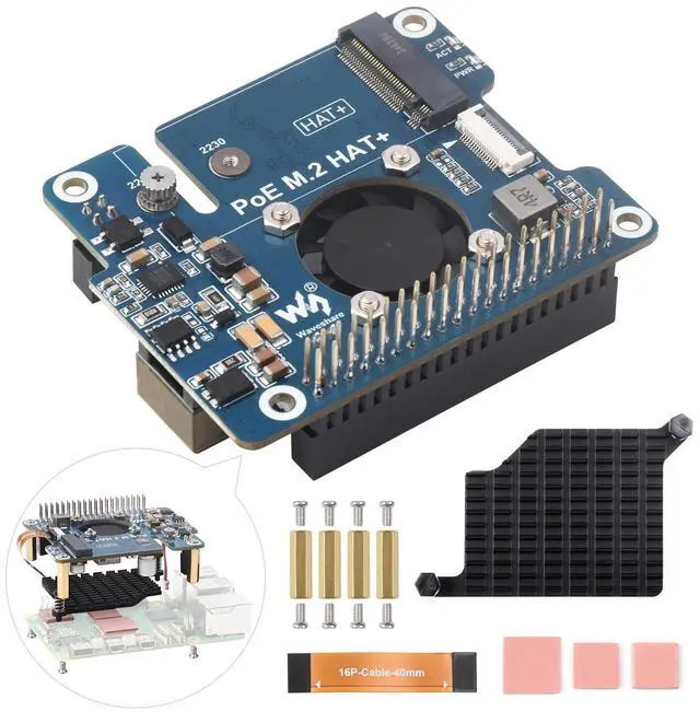 What is the HAT+? Based on the original HAT standard, the HAT+ is a new standard introduced by Raspberry Pi. Compatible with the Raspberry Pi 40PIN GPIO, plug-and-play. Integrates an EEPROM chip for cutomatic board configuration loading, simplifying the development process. Features standardized dimensions for a perfect fit with Raspberry Pi. Supports power supply through the Raspberry Pi 40PIN GPIO ^^ Based on 16PIN PCIe Interface of Raspberry Pi 5. Standard Raspberry Pi 40PIN GPIO stackable header, allows connecting other HATs ^^ Compatible With 2230/2242 Size M. 2 Solid State Drive Supports Gen2 and Gen3 Modes, Supports Booting PI5 From Solid State Drive ^^ Poviding both network connection and power supply for your Raspberry Pi in one cable ^^ 5V header provides up to 4.5A output (MAX 25W for 12V+5V total output power) be able to power extra devices while providing stable power to Raspberry Pi ^^