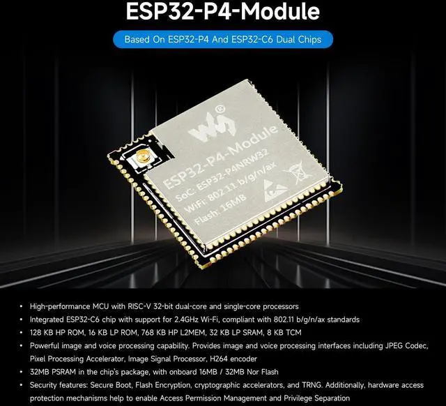Storage Options: The system includes 128KB High-Performance ROM (HP ROM), 16KB Low-Power ROM (LP ROM), 768KB HP L2 Memory, 32KB LP Static RAM, and 8KB Tightly Coupled Memory (TCM), offering efficient memory allocation for various processing tasks. Additionally, it supports up to 32MB PSRAM and 16MB/32MB options for onboard NOR Flash storage. ^^ Advanced Image and
