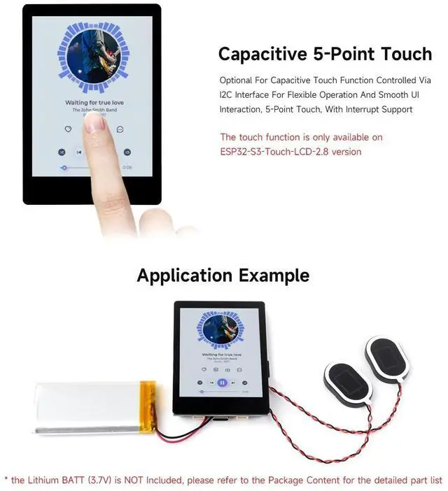 This product is a microcontroller development board with 2.4GH z WiFi and Bluetooth BLE 5 support, integrates high-capacity Flash and PSRAM. ^^ Equipped with high-performance Xtensa 32-bit LX7 dual-core processor, up to 240MHz main frequency Supports 2.4GH z Wi-Fi ( 802.11 b/g/n) and Bluetooth 5 (LE), with onboard antenna ^^ Built-in 512KB SRAM and 384KB ROM, with onboard 16MB Flash and 8MB PSRAM Onboard 2.8 inch LCD display, 240320 resolution, 262K color ^^ Adapting UART, I2C and some IO interfaces, integrates full-speed USB port Onboard speaker, QMI8658 6-axis sensor, RTC sensor, TF card slot and battery recharge management module, etc.