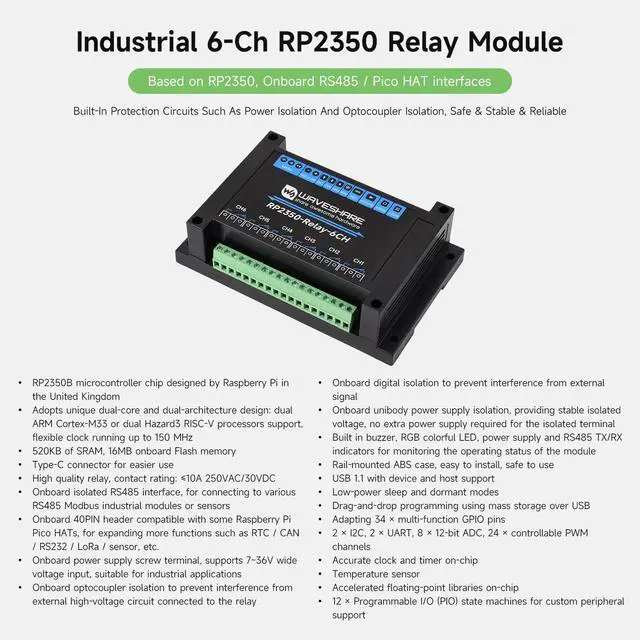 Connectivity & Expansion: With an onboard isolated RS485 interface for Modbus industrial modules, a 40PIN header compatible with Raspberry Pi Pico HATs, and a USB Type-C connector for easy power and data transfer, this microcontroller supports a wide range of connections and expansion options.