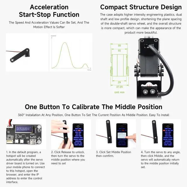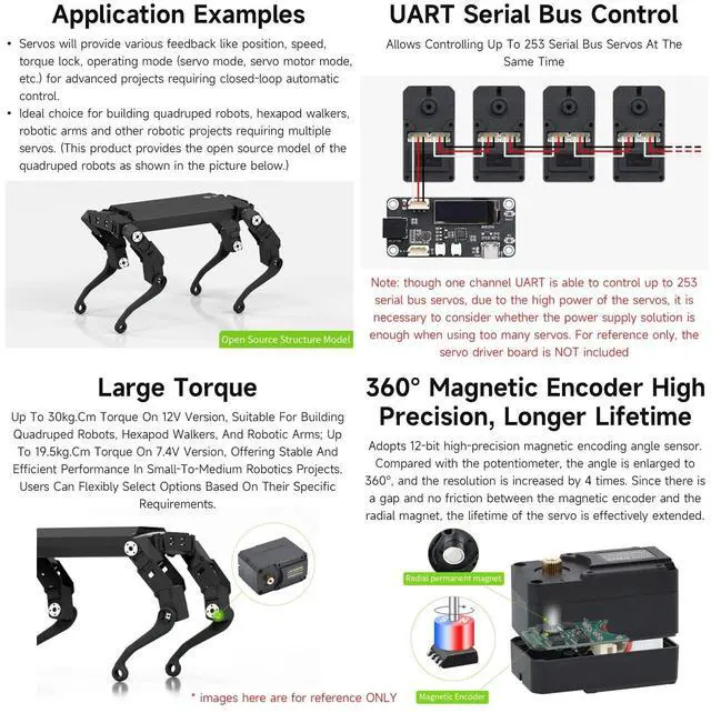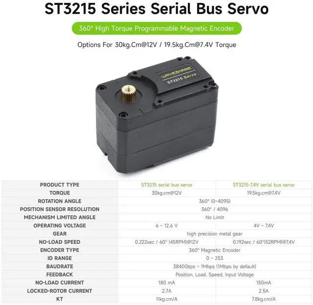 ^^ Encoder and Feedback: The servo features a 360 magnetic encoder with feedback capabilities, providing position, load, speed, and input voltage data for precise control and monitoring.