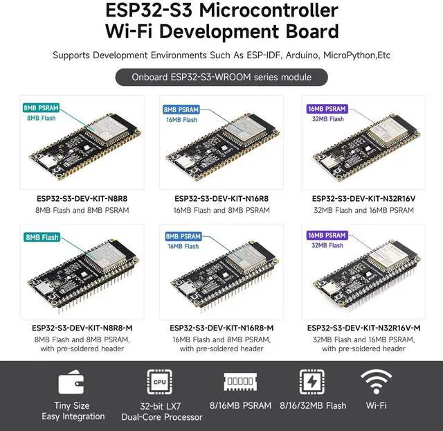 PSRAM: This board offers options for 8MB, 16MB, or 32MB Flash memory and 8MB or 16MB PSRAM, providing ample storage and memory for diverse applications. This option is 32MB Flash and 16MB PSRAM with Pre-soldered Headers ^^