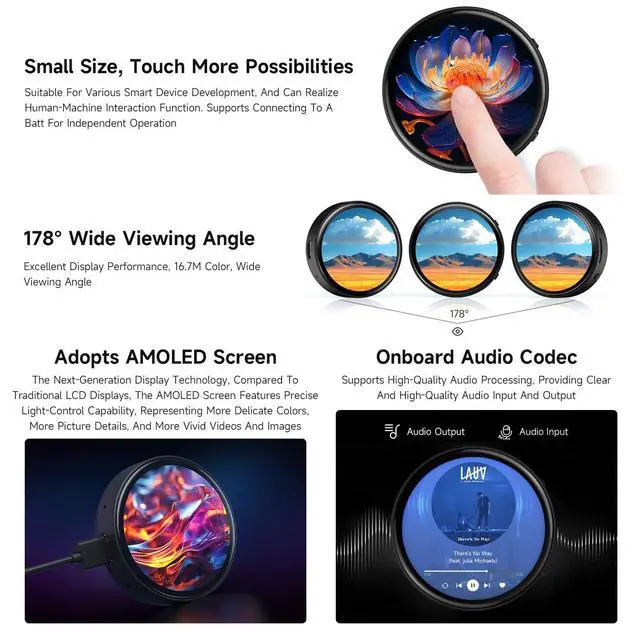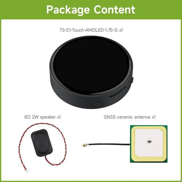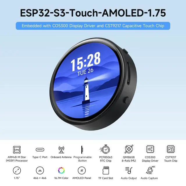 Onboard TF card slot for expanded storage, fast data transfer, and transfer flexibility, suitable for applications such as data recording and media playback, simplifying circuit design. ^^ Onboard 1.75 inch AMOLED capacitive touch display for clear color picture display, 466 466 resolution, 16.7M color. Onboard 8PIN 2.54 mm pitch female header, adapting 5 GPIO pins with reserved pads for connecting external devices and debugging, flexible peripheral configuration. ^^ Built-in CO5300 display driver and CST9217 capacitive touch chip, using QSPI and I2C communication respectively, effectively saving the IO resources.