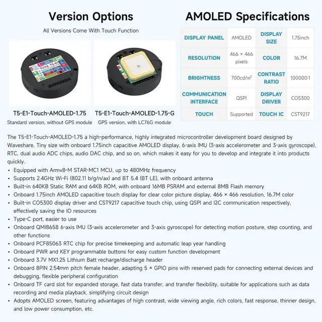 The T5-E1-Touch-AMOLED- 1.75 a high-performance, highly integrated microcontroller development board designed. Tiny size with onboard 1.75 inch capacitive AMOLED display, 6-axis IMU (3-axis accelerometer and 3-axis gyroscope), RTC, dual audio ADC chips, audio DAC chip, and so on, which makes it easy for you to develop and integrate it into products quickly. ^^ Equipped with Armv8-M STAR-MC1 MCU, up to 480MHz frequency. Supports 2.4GH z W F( 802.11 b/g/n/ax) and B-T 5.4 (BT LE), with onboard antenna. ^^ Built-in 640KB Static RAM and 64KB ROM, with onboard 16MB PSRAM and external 8MB Flash memory.