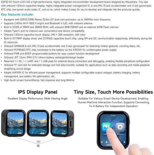 Advanced Display & Touch Interface: Features a 1.83 -inch capacitive touch display with a 240 284 resolution and 65K colors. The onboard ST7789P display driver and CST816D touch chip utilize SPI and I2C communication, conserving I/O resources while delivering high-quality display and touch interaction. ^^ Multi-Functional