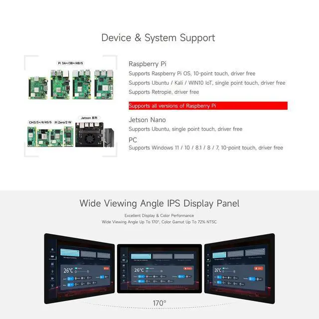 The display orientation is portrait by default, 10801920 resolution (HV). Change the software config for landscape display. ^^ Supports all versions of Raspberry Pi. Supports Ubuntu, single point touch, driver free. Supports Windows 11 / 10 / 8.1 / 8 / 7, 10-point touch, driver free ^^ Excellent display & color performance. Wide viewing angle up to 170, color gamut up to 72% NTSC ^^ Up to 10-point touch, depending on the operating system. Up to 6H hardness toughened glass panel. Optical bonding, display well and dustproof