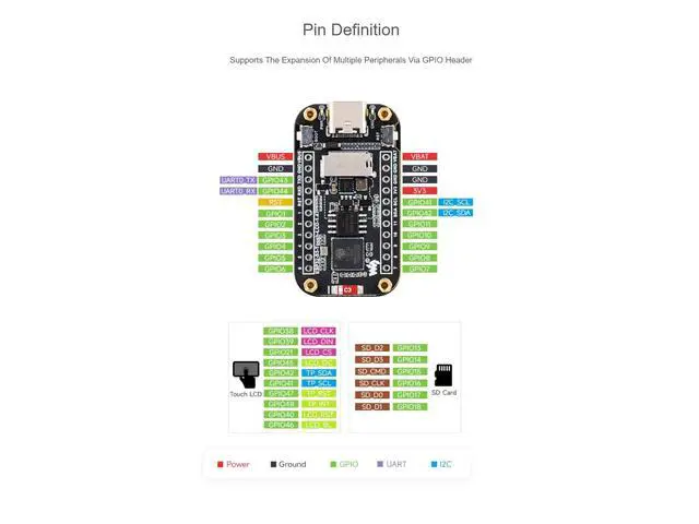 Onboard 1.47 inch capacitive touch LCD display, 172320 resolution, 262K colorAdapting multiple IO interfaces, supports full-speed USB standardOnboard TF card slot for external TF card storage of pictures or filesSupports accurate control such as flexible clock and multiple power modes to realize low power consumption in different scenariosLCD