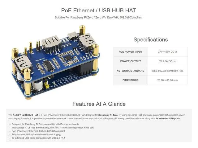 PACKAGE CONTENTPoE/ETH/USB HUB HAT x1USB HUB Board x1Screws pack x1Screwdriver x1Features At A GlanceThe PoE/ETH/USB HUB HAT is a PoE (Power over Ethernet) USB HUB HAT designed for Raspberry Pi Zero. By using this small HAT and some proper 802.3 af-compliant power sourcing equipments, it is possible to provide both network connection and power supply for your Raspberry Pi in only one Ethernet cable, along with 3x extended USB ports. Designed for Raspberry Pi Zero, compatible with Zero series boardsIncorporates RTL8152B Ethernet chip, with 10M/100M auto-negotiation RJ45 portPoE (Power over Ethernet) feature, 802.3 af-compliantFully isolated SMPS (Switch Mode Power Supply) 3x extended USB ports, compatible with USB 2.0 / 1.1