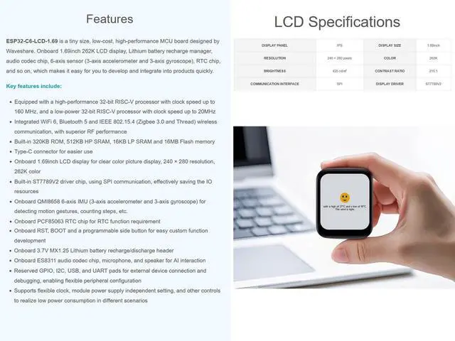 OverviewESP32-C6 1.69 inch LCD Development Board, 240280 Pixels, Supports Wi-Fi 6 / BLE 5, 160MHz RISC-V Processor, AI Speech, ESP32 With DisplayFeaturesEquipped with a high-performance 32-bit RISC-V processor with clock speed up to 160 MHz, and a low-power 32-bit RISC-V processor with clock speed up to 20MHzIntegrated WiFi 6, Bluetooth 5 and IEEE 802.15. 4 (Zigbee 3.0 and Thread) wireless communication, with superior RF performanceBuilt-in 320KB ROM, 512KB HP S-R-A-M, 16KB LP S-R-A-M and 16MB Flash memoryType-C connector for easier useOnboard 1.69 inch LCD display for clear color picture display, 240 280 resolution, 262K colorBuilt-in ST7789V2 driver chip, using SPI communication, effectively saving the IO resourcesOnboard QMI8658 6-axis IMU (3-axis accelerometer and 3-axis gyroscope) for detecting motion gestures, counting steps, etc.