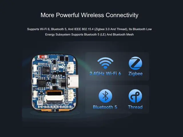 Onboard PCF85063 RTC chip for RTC function requirementOnboard RST, BOOT and a programmable side button for easy custom function developmentOnboard 3.7V MX 1.25 Lithium battery recharge/discharge headerOnboard ES8311 audio codec chip, microphone, and speaker for AI interactionReserved GPIO, I2C, USB, and UART pads for external device connection and debugging, enabling flexible peripheral configurationSupports flexible clock, module power supply independent setting, and other controls to realize low power consumption in different scenariosPackage ContentESP32-C6-LCD- 1.69 16 1W speaker 1NOTE: Online Development Resources and Technical Support are provided, please feel free to contact us if you have any problem!