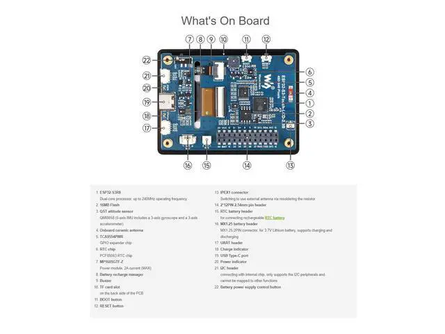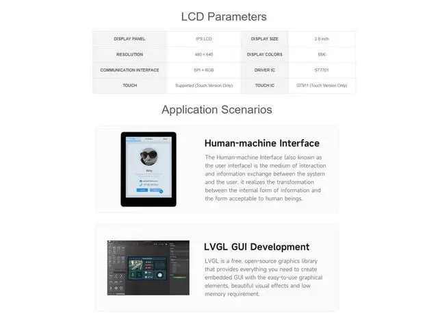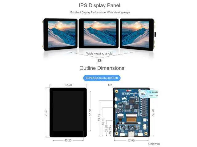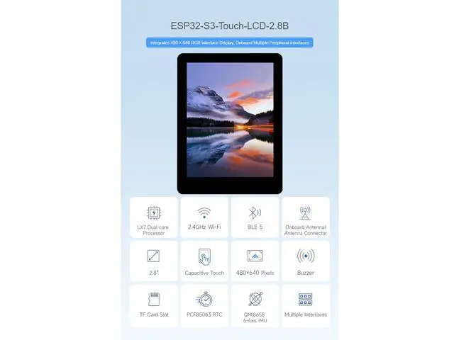 ESP32-S3-Touch-LCD- 2.8I ntegrates SPI Interface Display, 240320 Pixels, Multiple Peripheral Interfaces ^^ IPS Display PanelExcellent Display Performance, 262K Color, Wide Viewing Angle ^^ Capacitive 5-Point TouchOptional For Capacitive Touch Function Controlled Via I2C Interface For Flexible Operation And Smooth UI Interaction, 5-Point Touch, With Interrupt Support ^^ Supports Multiple PeripheralsSupports The Expansion Of Multiple Peripherals Via GPIO, UART And I2C Interfaces, Etc.
