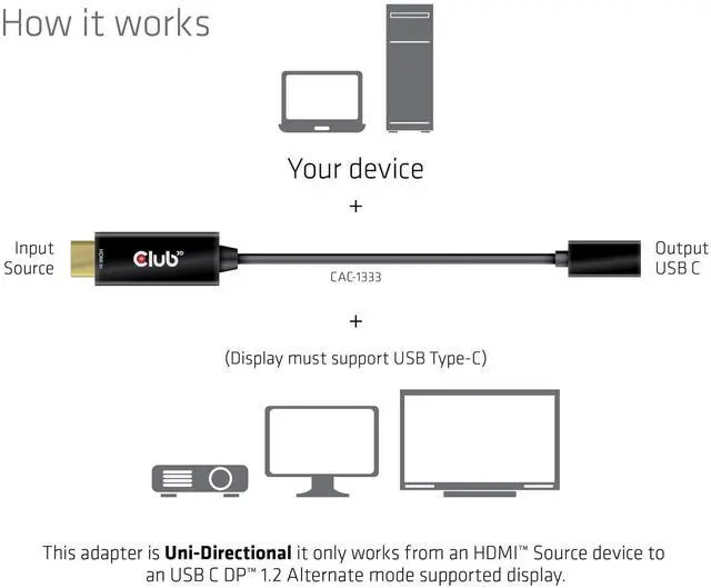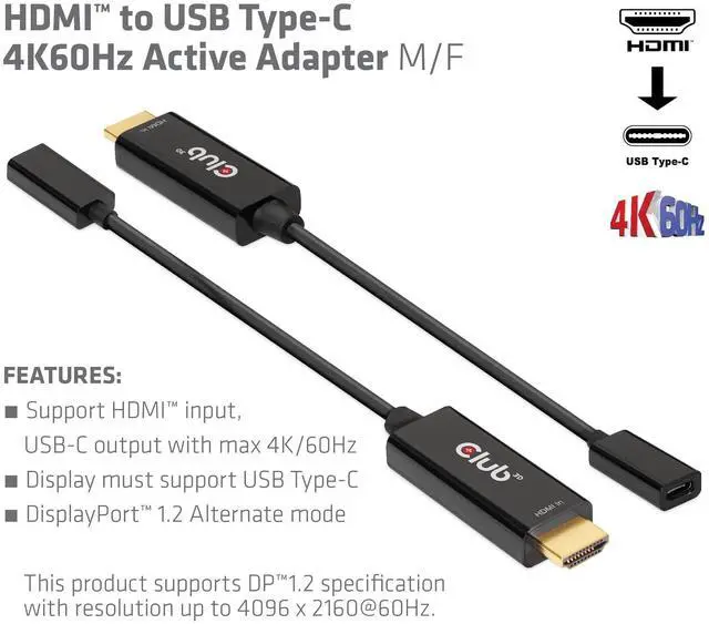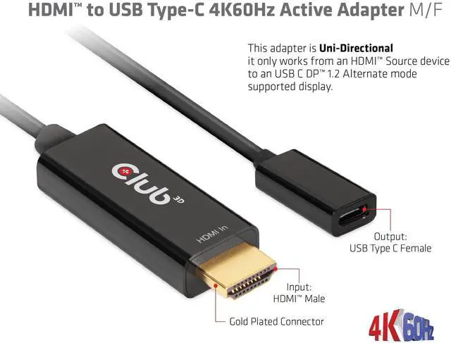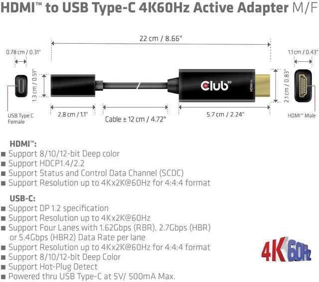 Supports HDMI input, USB-C output with max. 4K/60Hz ^^ Supports resolutions up to 4Kx2K @60Hz ^^ Power supply via USB Type-C at 5V/500mA max. ^^ USB-C supports four lanes with a data rate of 1.62G bps (RBR), 2.7G bps (HBR), or 5.4G bps (HBR2) per port ^^ Meets ROHS, FCC and CE EMI requirements ^^ Note This adapter only works with self-powered USB Type-C displays! ^^ Note - Please update your TV's firmware to the version that supports these resolutions/refresh rate!