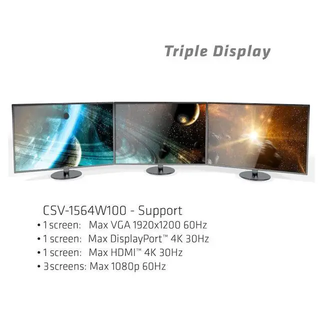 TRIPLE DISPLAY SUPPORT: With three different video ports, this docking station allows you to enjoy three different images or videos on three different displays simultaneously, including 1x HDMI 4K30Hz, 1x DP 4K30Hz, and 1x VGA 1920x1080@60Hz, under MST mode 720p and SST mode 1080p ^^