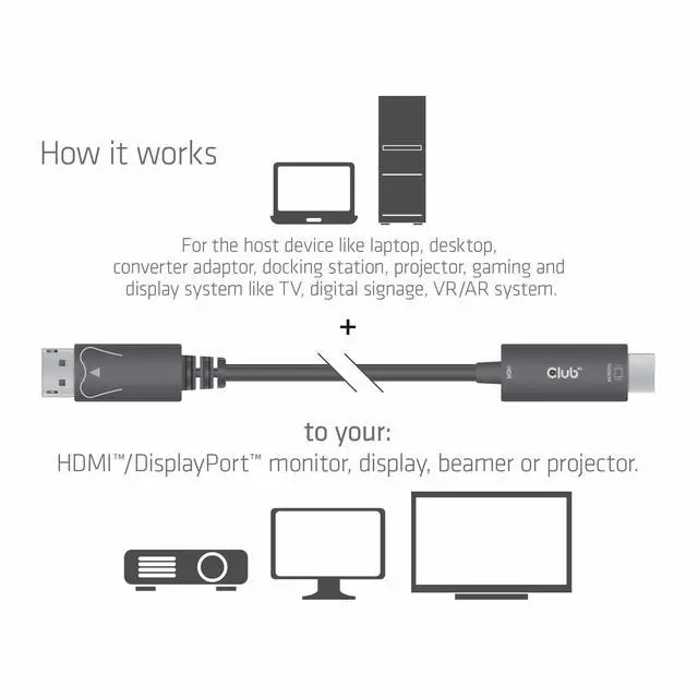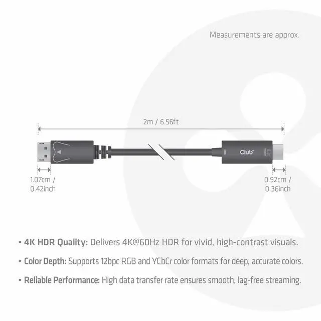 This high quality DisplayPort 1.4 to HDMI adapter cable from Club3D provides a reliable connection for your multimedia devices. With a length of 2 metres, it allows flexible installation options. The active cable supports impressive 4K resolution at 60Hz and HDR (High Dynamic Range) for crisp images with vivid colours. The active signal amplification ensures stable transmission without loss of quality. The black cable is ideal for connecting modern graphics cards to HDMI-enabled monitors or TVs. DisplayPort 1.4 technology provides high bandwidth for demanding multimedia applications. The cable is the perfect solution for gaming, home office or professional presentations where high-resolution image quality is required.