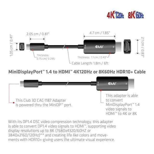 Please note: 8K 30Hz or 4K 120Hz requires a mini DisplayPort 1.4 source, the adapter does not need external power( Powered thru the Mini-DisplayPort connection)