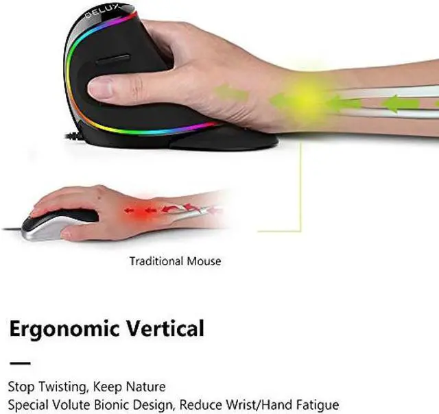 Delux M618Plus RGB Backlight Wired Vertical Mouse Delux M618 Plus RGB is our special product vertical mouse of 5th generation. It apopted ergonomic design, which can alleviate the arm discomfort and stiff feeling, let you say goodbye to "mouse hand".