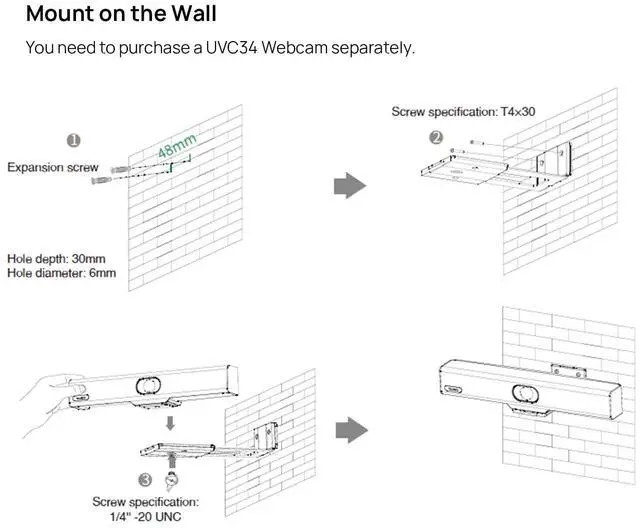 Yealink BRK-VC118 Mounting Bracket compatible with Yealink UVC34 4K Conference Camera. ^^ The package does NOT include UVC34. ^^ The original UVC34 packages already contain a mounting kit. If your mounting accessory is broken, this can be used as a replacement. ^^ If the mounting bracket is missing when the UVC34 webcam arrives, we will reissue you a replacement when we receive your message. ^^ Any missing accessories please let us know directly. Yealink products have a 2-year warranty.