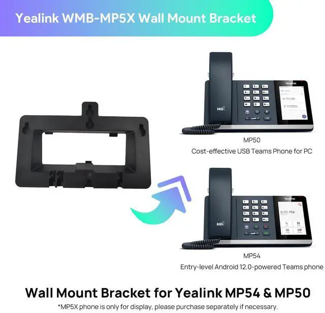 Compatible with Yealink MP54 and MP50 teams phone wall mount. ^^ The package contains wall mounting bracket X1, user manual X1. ^^ Package does not come with screws. ^^ The recommended height is less than 2m above the ground. ^^ * For other Yealink phone models, please choose the corresponding wall-mounting bracket.