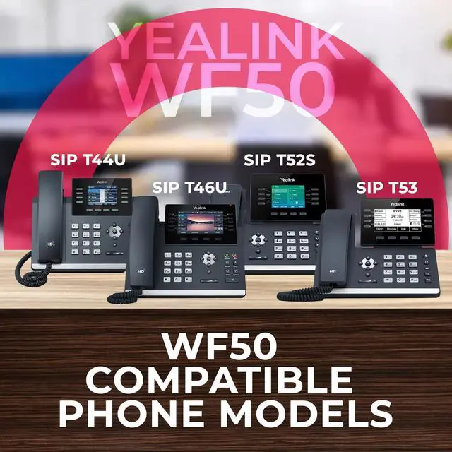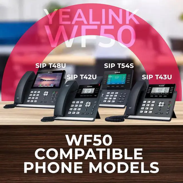 Bundled in The Box Yealink WF50 dongle, and Global Teck Microfiber Cloth; Insert WF50 into the Yealink phone USB port, then enable WiFi on the Yealink phone screen and join your network, supports WPA, WPA2, and WPA2 Enterprise security ^^ FOR YEALINK IP DESK PHONES ONLY Compatible only with supported Yealink desk phones, not compatible and will NOT work with PCs, laptops, or tablets; not compatible with Cisco, Avaya, Poly, Polycom, Grandstream, or any non Yealink phone brand ^^ COMPATIBLE YEALINK MODELS Compatible with T42S, T43U, T44U, T46S, T46U, T48S, T48U, T53, T54S, T55A, T56A, T57W, T58A, T73U, T74U, T77U, MP54, MP56, check your phone model on the back label before ordering, to ensure compatibility ^^ NOT BLUETOOTH, NOT FOR WIRELESS HEADSETS This is a WiFi adapter for connecting a compatible Yealink desk phone to a WiFi network, it does not add Bluetooth, it does not pair with Bluetooth headsets, it does not enable any wireless headset connection to the Yealink Desk Phone ^^ FIRMWARE REQUIRED FOR DETECTION Firmware version 84 or higher is required for the phone to recognize the WF50, if firmware is older, the dongle may appear not working, check on the phone, Menu, Status, More, Firmware, update through your IT administrator or Yealink support before use