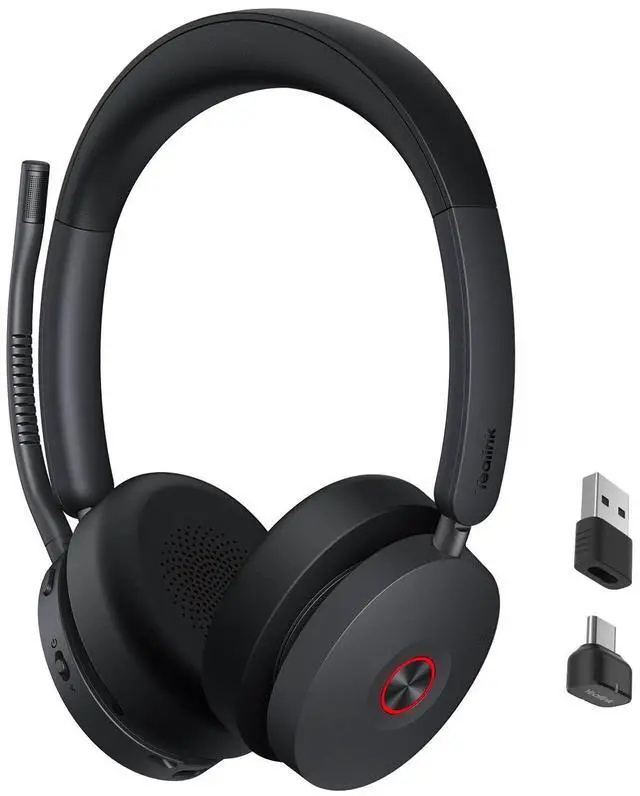 4-modes of ANC: Immersive - Comfort - Ambient Sound - Off. Hold for 2s to enter "Immersive ANC" mode, which is suitable for people with strong sound insulation needs. ^^ Immersive Calls BH74 is certied for Microsoft Teams Premium Open Ofce, equipped with excellent voice noise reduction and voice pick-up technology. With the assistance of Yealink Acoustic Shield Technology 3.0 and four high-quality microphones, BH74 can lter out environmental noise from various directions, only pick up your voice to deliver. ^^ UC Compatible Yealink has always maintained close cooperation with Microsoft. This new BH74 bluetooth headset has been certified by Microsoft Teams and Zoom, also compatible with Google Meet and 100+ other mainstream platforms via BT51 dongle, and support dual connection via mobile Bluetooth search. ^^ Ultra-long Battery Life Yealink's battery performance has always maintained an industry advantage, this BH74 work headset is designed to provide an exceptional talk time of up to 32 hours and music time of up to 65 hours, ensuring that you can stay connected and engaged for extended periods without worrying about battery life. ^^ USB-C to A Plug-and-Play BH74 comes with 1x TypeC to A usb dongle, which is connected after plugging in on the computer without manual pairing or any drivers.
