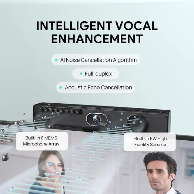 Ultra HD 4K camera with 1/ 2.8 -inch CMOS120 super-wide-angle lensElectric lens capAuto Framing and AI Face EnhancementBuilt-in Wi-Fi, remote device managementApplicable to most popular video conferencingPlatforms