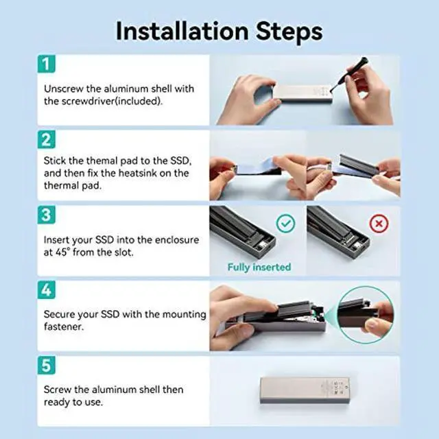 [(Under Safe Temp after 24 Hours of Full Workload)] The M.2 SATA Enclosure adopts the optimized "sandwich" design: Thermal Silicone pad pasted on your ssd to absorb the waste heat - Aluminum Heatsink covered the ssd and thermal pad(increase the heat dissipation area) - Install them into the premium aluminum enclosure. The optimized structure will cool your M.2 SSD to a safe temp to avoid overheating and lower speed, improving the performance of your ssd.