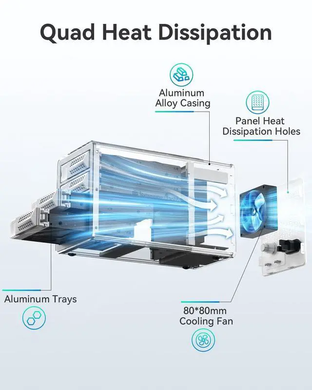 The VN400C3 4-bay hard drive enclosure is equipped with a 150W built-in power supply and supports Auto Power-On After a Power Loss. In the event of an unexpected power outage, the device will automatically restart once power is restored. ^^ Aluminum DAS Enclosure & Cooling FanThe VN400C3 4-bay USB-C SATA hard drive enclosure features a stylish aluminum casing and a low-noise cooling fan. Equipped with front and rear cooling holes, this 4-bay DAS HDD enclosure ensures effective heat dissipation and promotes air convection, keeping your drives cool during prolonged use. Removable metal trays facilitate easy drive installation and replacement.