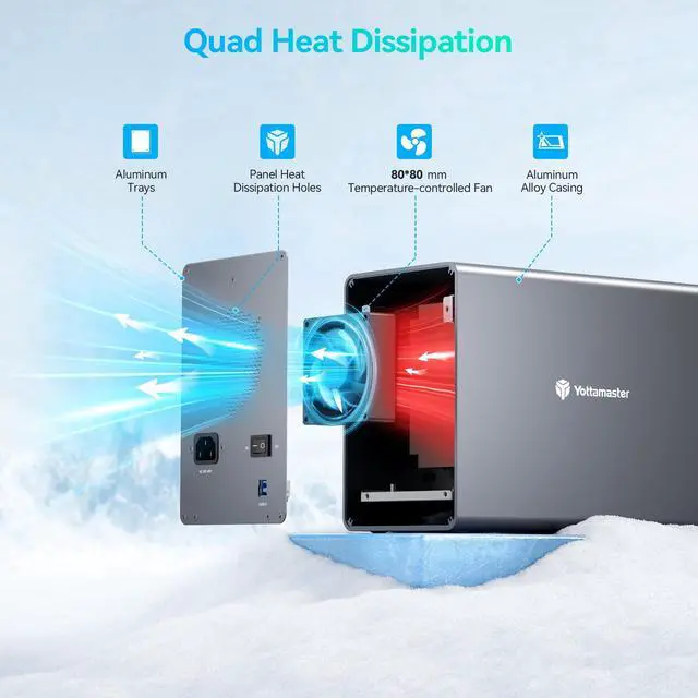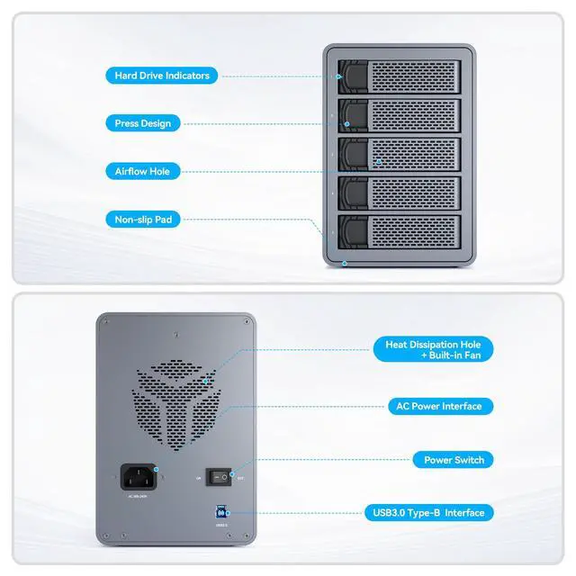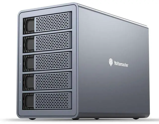 ^^ For 2.5" / 3.5" SATA HDD & SSDYottamaster 5 bay hdd enclosure designed for both 2.5 inch SATA and 3.5 inch SATA HDD/SSDs. Its removable aluminum trays facilitate easy installation and replacement of drives. The included screws securely fix the hard drives to the trays, effectively protecting them from shock and interface damage. ^^ Aluminum-Alloy Enclosure & 80mm Silent FanThe 5-bay USB 3.0 SATA hard drive enclosure boasts a sleek aluminum-alloy shell and an intelligent temperature control fan, providing optimal cooling with low noise. The fan adjusts its speed automatically based on the hard drive's temperature.