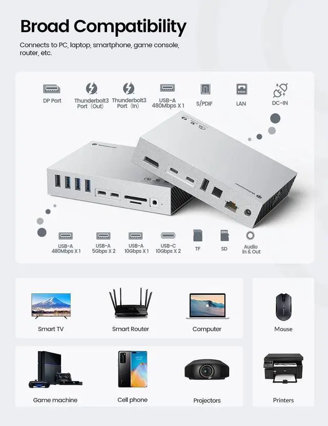 15 in 1 40Gbps USB C Docking StationThis 40Gbps USB C dock is compatible with Thunderbolt 3 ports, 1x DisplayPort 1.4, 2x USB-C port (10Gbps), 1x USB-A port (10Gbps), and 2x USB-A 3.0 (5 Gbps), 2x USB-A 2.0 (480 Mbps), 1x Gigabit Ethernet port, USB 2.0 SD/TF card reader slot, S/PDIF, 3.5 mm audio, and 65W power input, providing powerful and stable connectivity options. ^^ Single 8K@30Hz & Dual 4K@60Hz DisplayUSB c docking station supports dual displays and can extend to dual 4K@60Hz displays via the Thunderbolt 3 port (OUT) and DisplayPort 1.4.